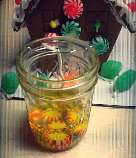 This peppermint candle was homemade using a small, found jar, and a wick held in place by a piece of wire, and then filled with olive oil found in the kitchen. Peppermint candies (from Sonic happy hour) were dropped in to get a peppermint smell, but you can use whatever scent you'd like. Just be sure to use olive oil, as it has a more tolerant smoking point than other oils.